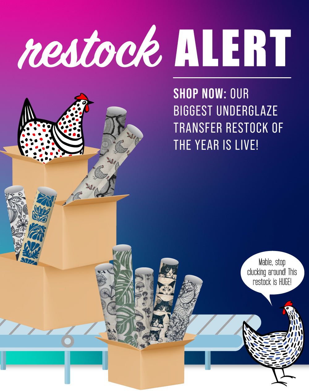 In 2018, Leigh Anne began collaborating with graphic designers and fellow artists to develop a line of transfers that reflect the creativity and diversity of the modern ceramic community. Today, Elan Transfers is proud to be the leading source for contemporary underglaze decals, offering over 400 unique designs in a wide range of colors and styles.